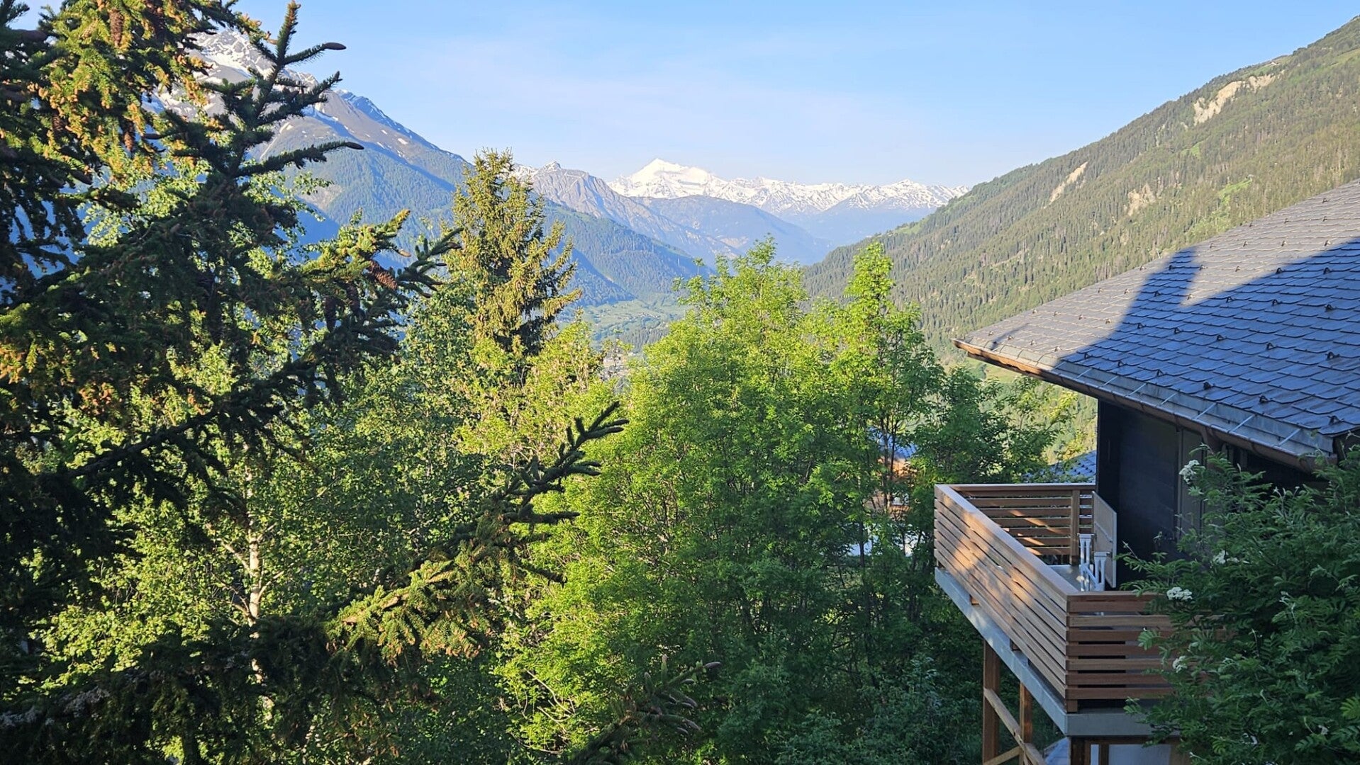 Der schöne Balkon und der grosszügige Sitzplatz bieten einen atemberaubenden Blick auf die Walliser Alpen - den ganzen Tag.